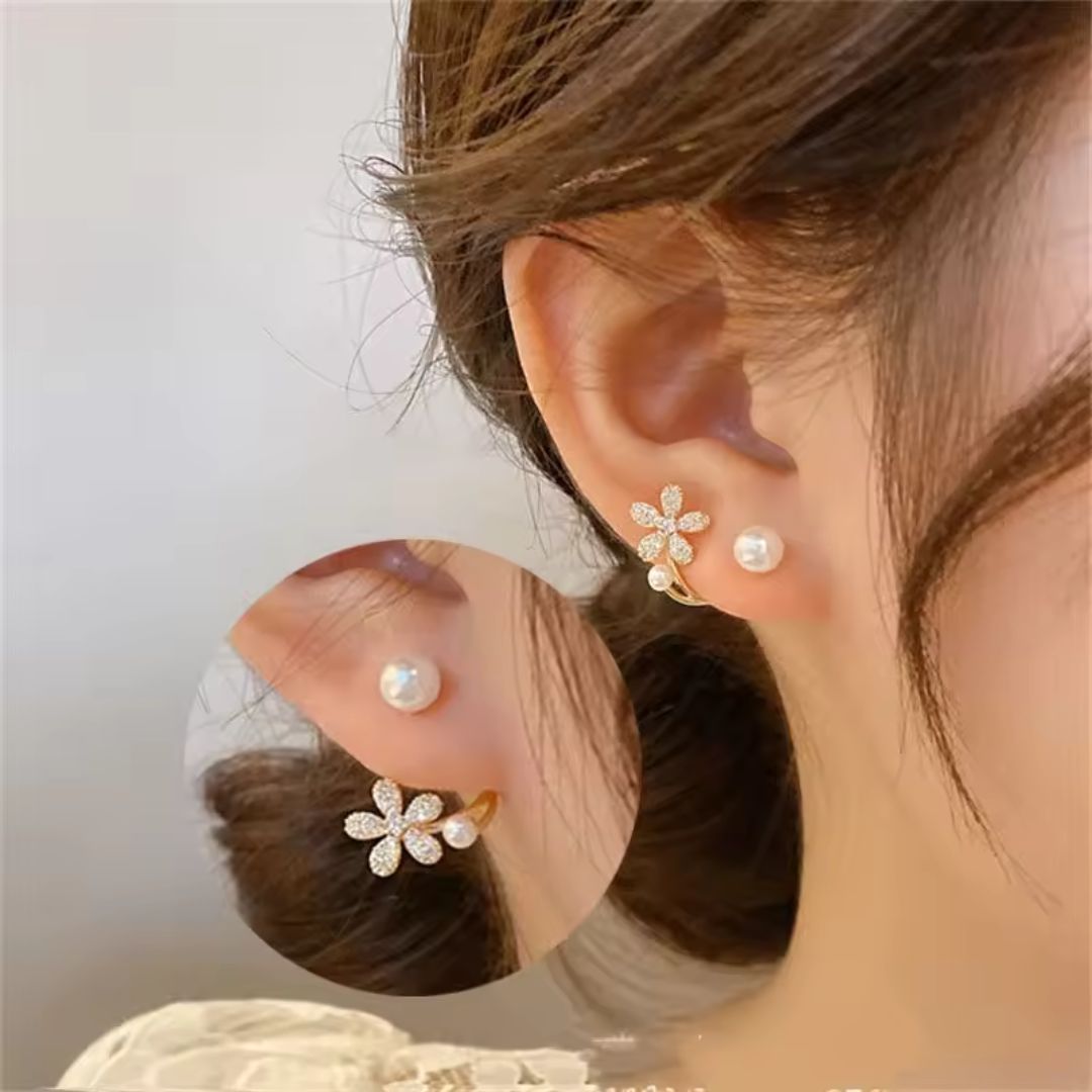 Two-Wearing Diamond Encrusted Flower Pearl Stud Korean Earrings For Women And Girls 2 Pcs/Set. These beautiful gold-plated Pearl earrings are perfect for every day wear or any special occasion. They feature Class, Elegance, and Beauty that are sure to make you stand out from the crowd. Dressed in ethnic or western wear, these earrings give a glamorous look and sparkling color to any outfit you are in the mood for. Perfect to add a splash of drama to any outfit day or night